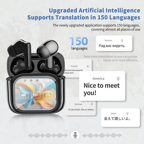 Product code: DG2240Size: 59*51*26mmMaterials: ABS & PCDescription: 144+ Languages TranslationTouchable smart screen ANC active Noise Reduction + ENC call Noise Reduction Battery: 30/300mAhPlaytime: 3-4hrs